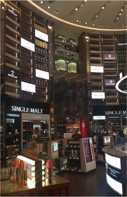 No airport travel is complete without a little shopping, so this was my next job! Of course, the stores were beautiful. Beautifully designed, merchandised and styled. I was particularly impressed with the liquor category where DFS had cleverly created a ‘vault style’ store that made you feel like you were in a distillery or wine cellar…