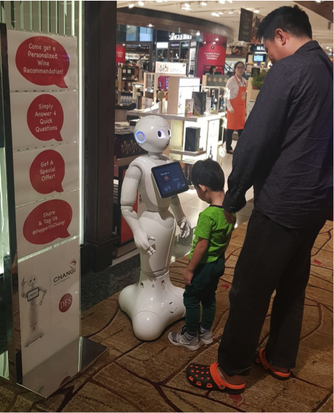 As I wandered around the various stores, gradually discovering designer boutiques and new concept stores I happened upon a really fun use of AI outside the Wine Reserve. I have encountered ‘Pepper’ the robot before online but never actually met him or her in real life. Pepper is a semi-humanoid robot designed with the ability to read emotions. What DFS have cleverly done here is use Pepper to engage with passengers to help them determine the type of wine they should purchase. Whatever your opinion or take on the use of AI in the retail sphere – you can’t help but find this impressive. I watched for several minutes as different demographics came and interacted with Pepper. Some genuinely using Pepper’s guidance as a motive to purchase and some (like this young boy and his father) who were just playing around with the settings and exploring Pepper’s capabilities. What I was certain of was that DFS were exploring different types of technology and experimenting with ways of interacting and influencing purchase decisions.